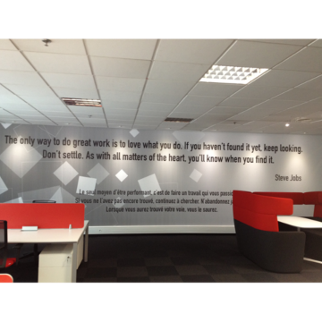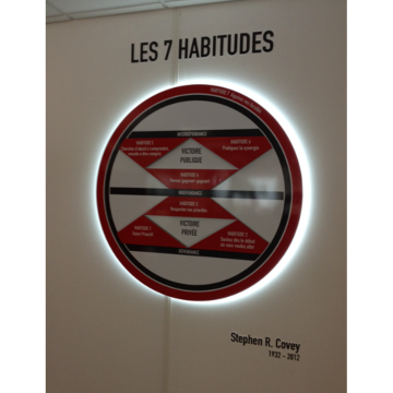 Diamètre 1150 mm rond en aluminium avec éléments en relief en plexi et rétro éclairage par led + lettres en PVC adhésivées sur le mur en dessus et en dessous