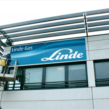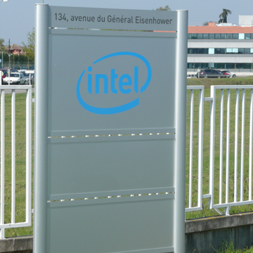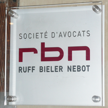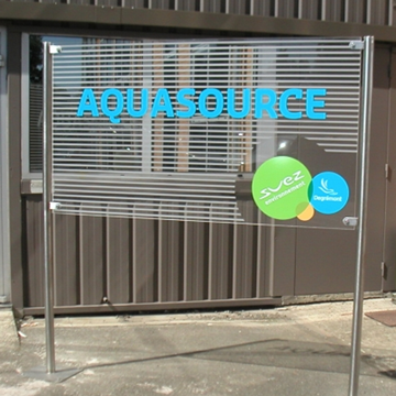 Caisson an aluminium anodisé avec 2 plaques en plexi épaisseur 8 mm montées sur entretoises, vinyle vert clair au dos et texte en vinyle de couleur au recto
